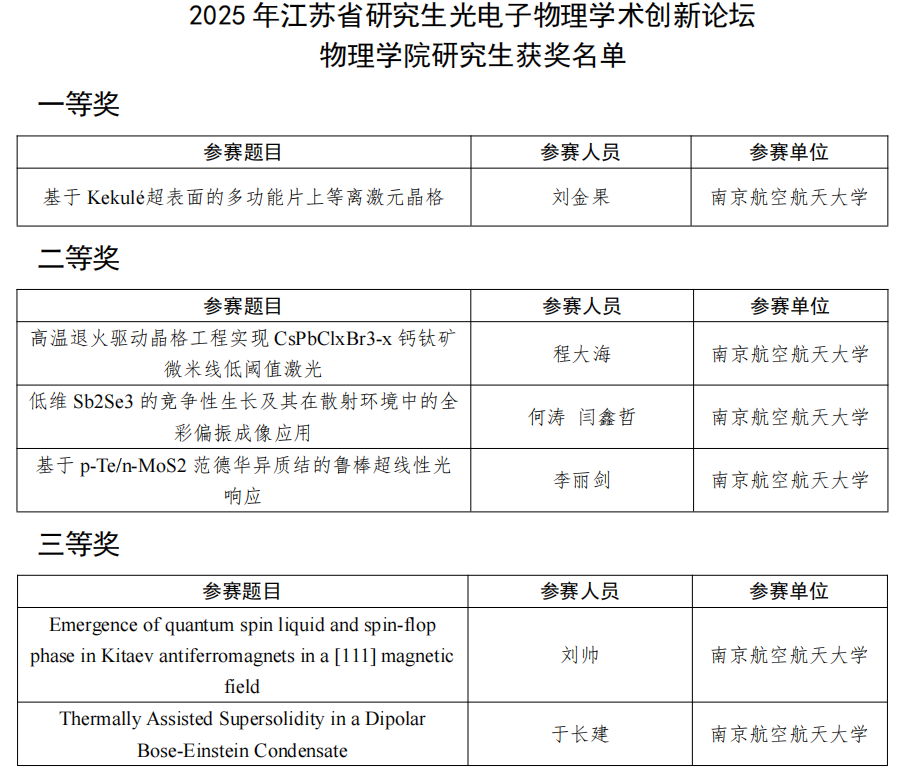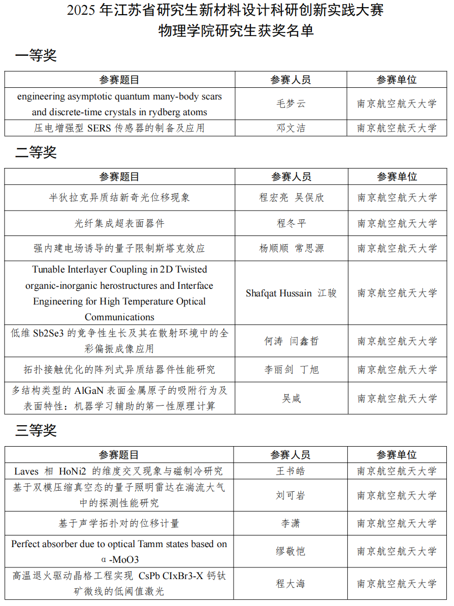 近日,2025年江苏省研究生新材料设计科研创新实践大赛、江苏省研究生光电子物理学术创新论坛分别在镇江举办。我院研究生积极参赛,共荣获一等奖3项、二等奖10项、三等奖7项。