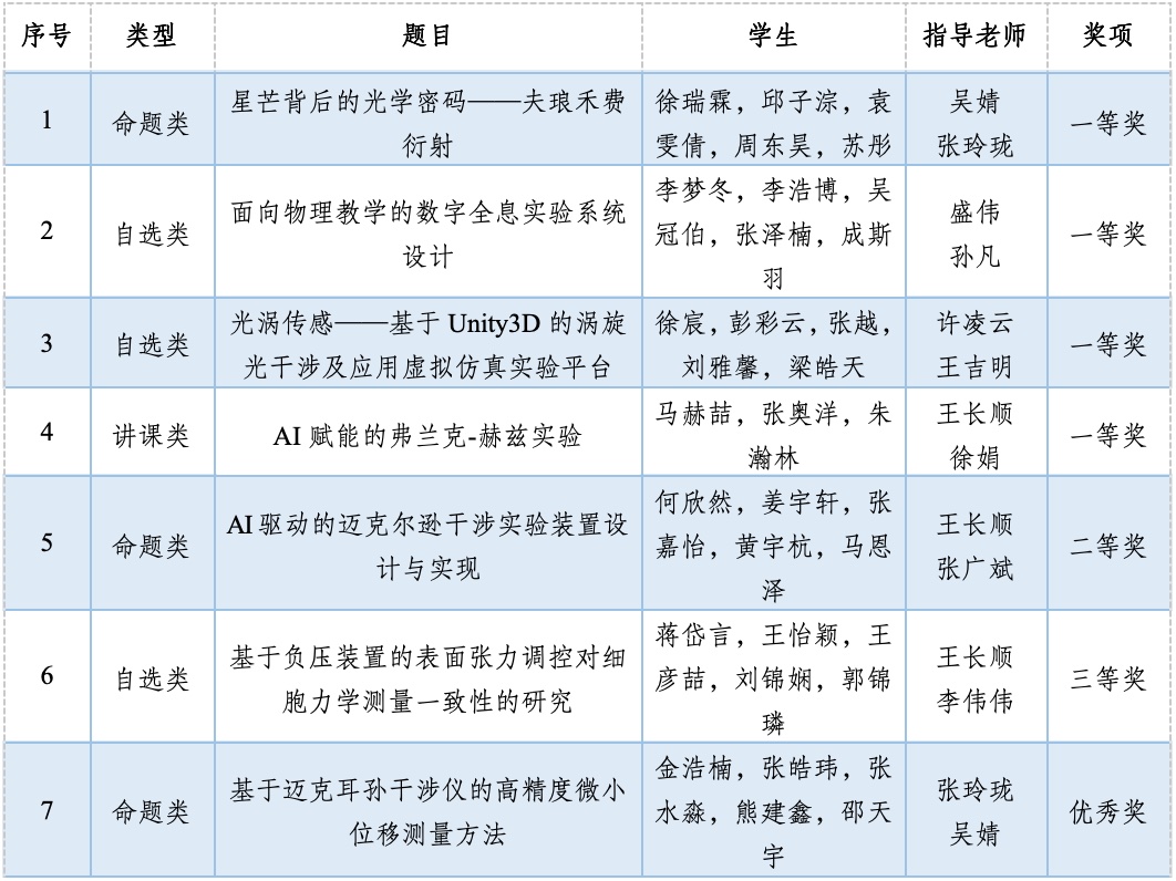 南航代表队在学校教务部的大力支持和星空体育app下载 的精心组织下,共派出7支队伍参赛,其中有5支队伍成功晋级全国总决赛,共获一等奖4项、二等奖1项、三等奖1项,优秀奖1项,创参赛以来最好成绩!星空体育app下载 一等奖获奖数量与获奖比例均位居全国参赛高校前列,是一等奖覆盖所有赛道(讲课类、自选类和命题类)的高校,同时星空体育app下载 连续第六年成功摘得优秀组织奖,充分彰显了学院在物理实验教学与创新人才培养方面的深厚积淀。